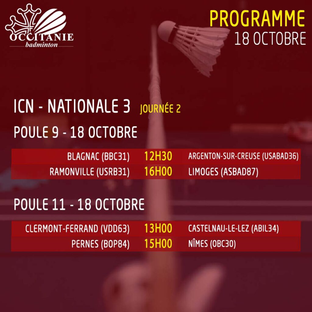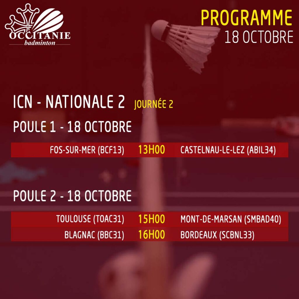 Découvrez le programme de la seconde journée des ICN pour les équipes occitanes, qui se déroulera le samedi 18 octobre.