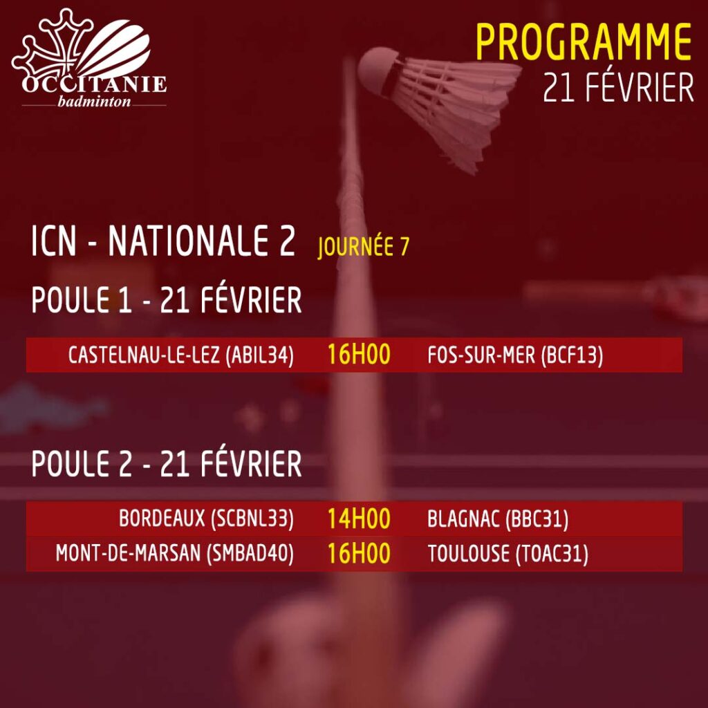 Le programme du week-end – ICN – J7 Published by Charlène Palat 19 février 2026 Découvrez le programme des équipes occitanes engagées en N2 et en N3.
